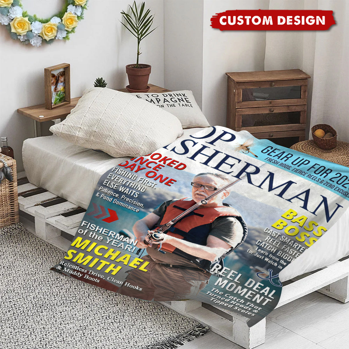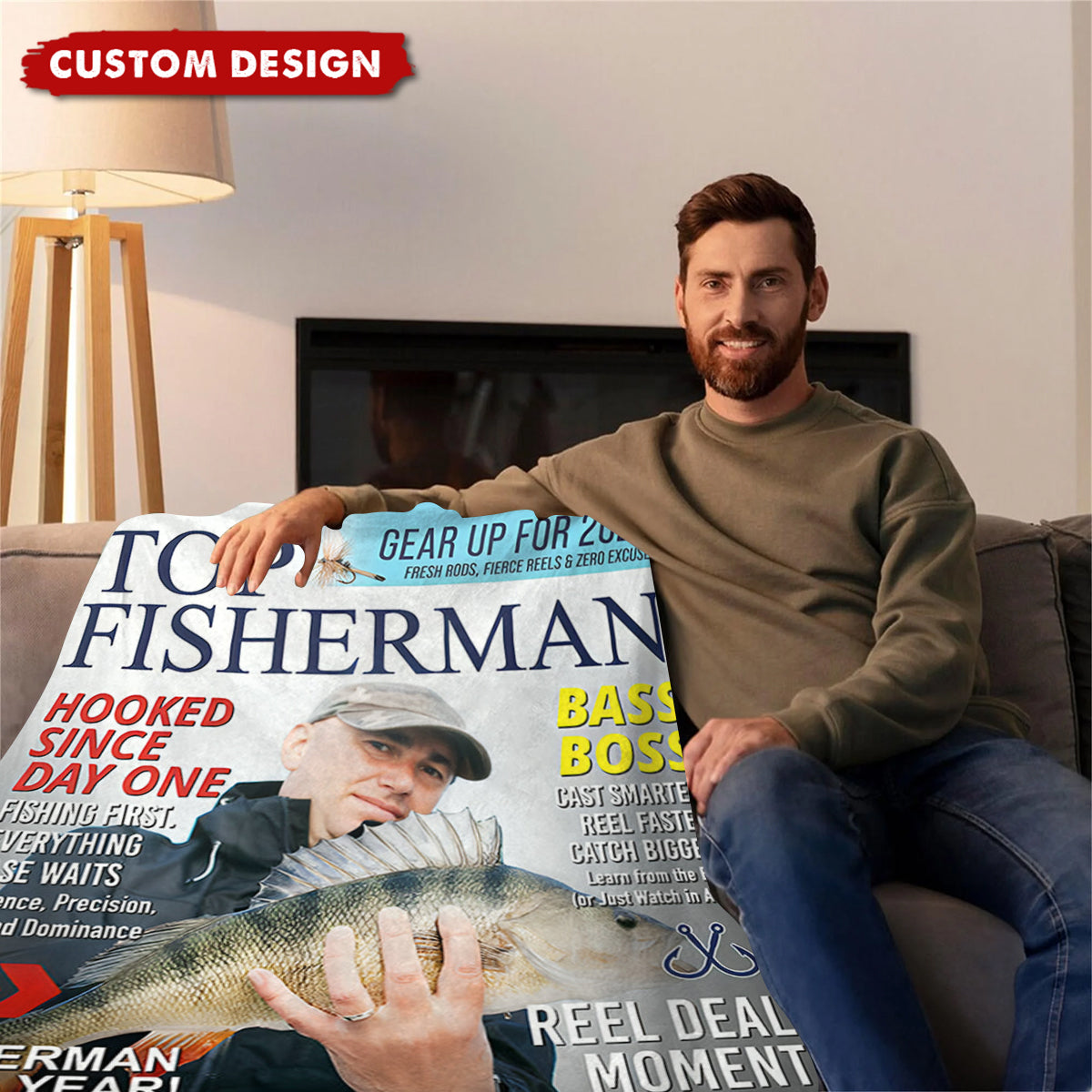Our Custom “Top Fisherman” Blanket transforms any photo into a bold, eye-catching magazine cover—perfect for fishermen who deserve the spotlight.