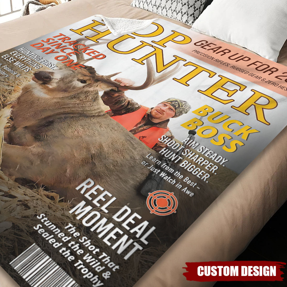 This personalized Top Hunter blanket transforms your photo into a realistic outdoor magazine front page — complete with custom name, headlines, and hunting-themed graphics. A perfect gift for husbands, dads, boyfriends, or anyone who lives for the thrill of the hunt.
