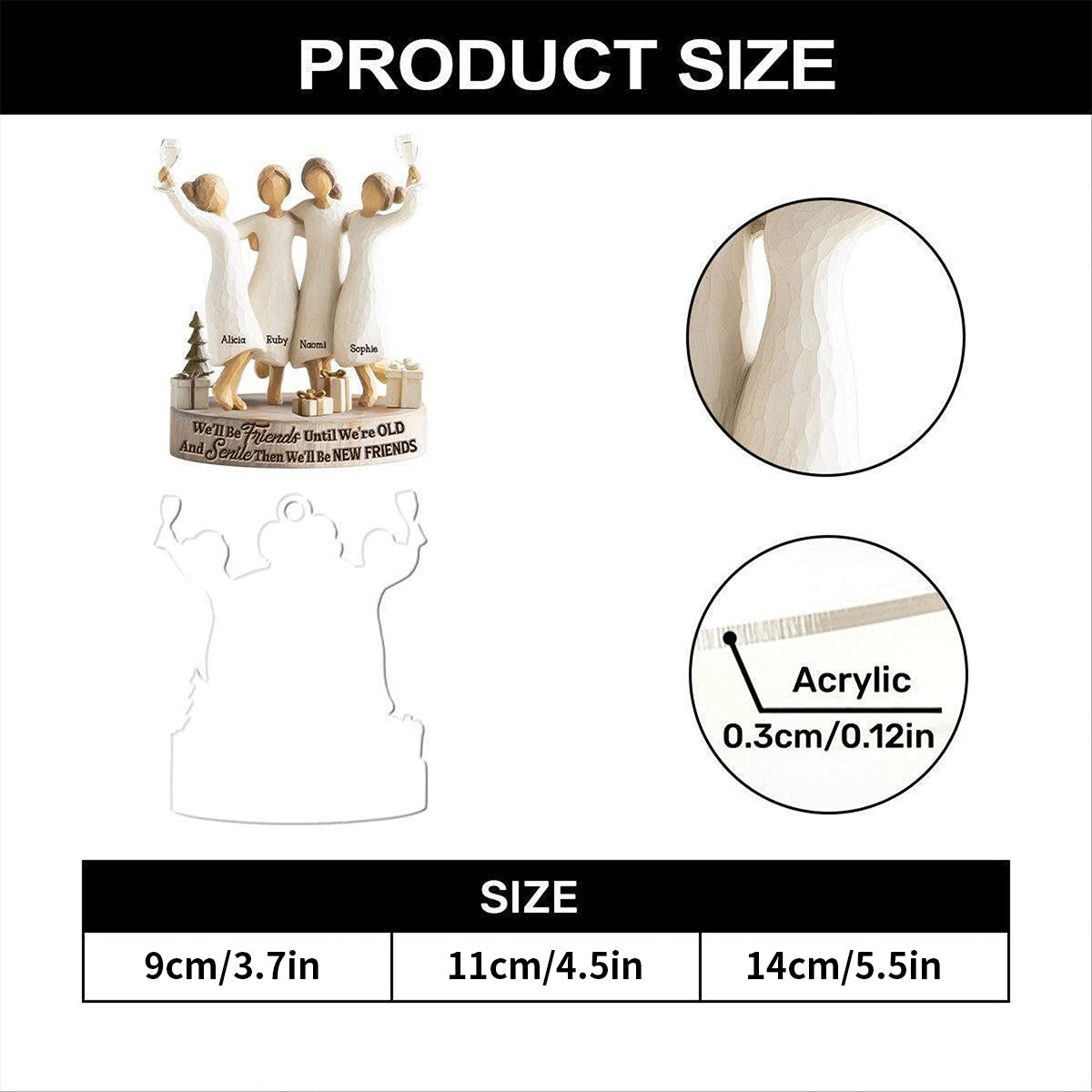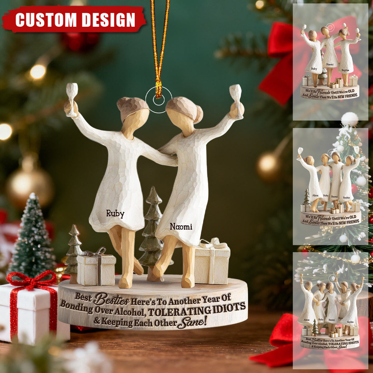 Each ornament features a charming carved-style figurine of best friends raising a toast—perfect for capturing your unique sisterhood. Add your custom names and choose the quote style that reflects your friendship, whether heartfelt or humorously chaotic!
