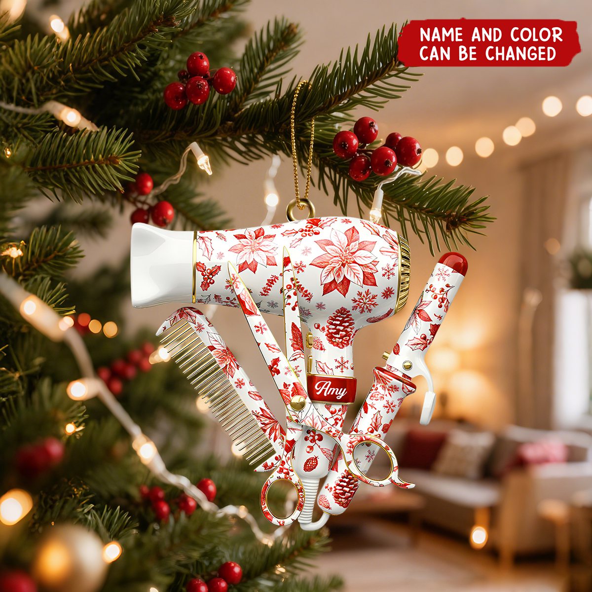 Celebrate the talent, passion, and creativity of hairstylists with this beautifully designed Personalized Hairstylist Christmas Ornament! Shaped with essential salon tools—hair dryer, scissors, comb, and curling iron—this ornament is the perfect festive tribute to every hairdresser, beautician, barber, and salon professional.